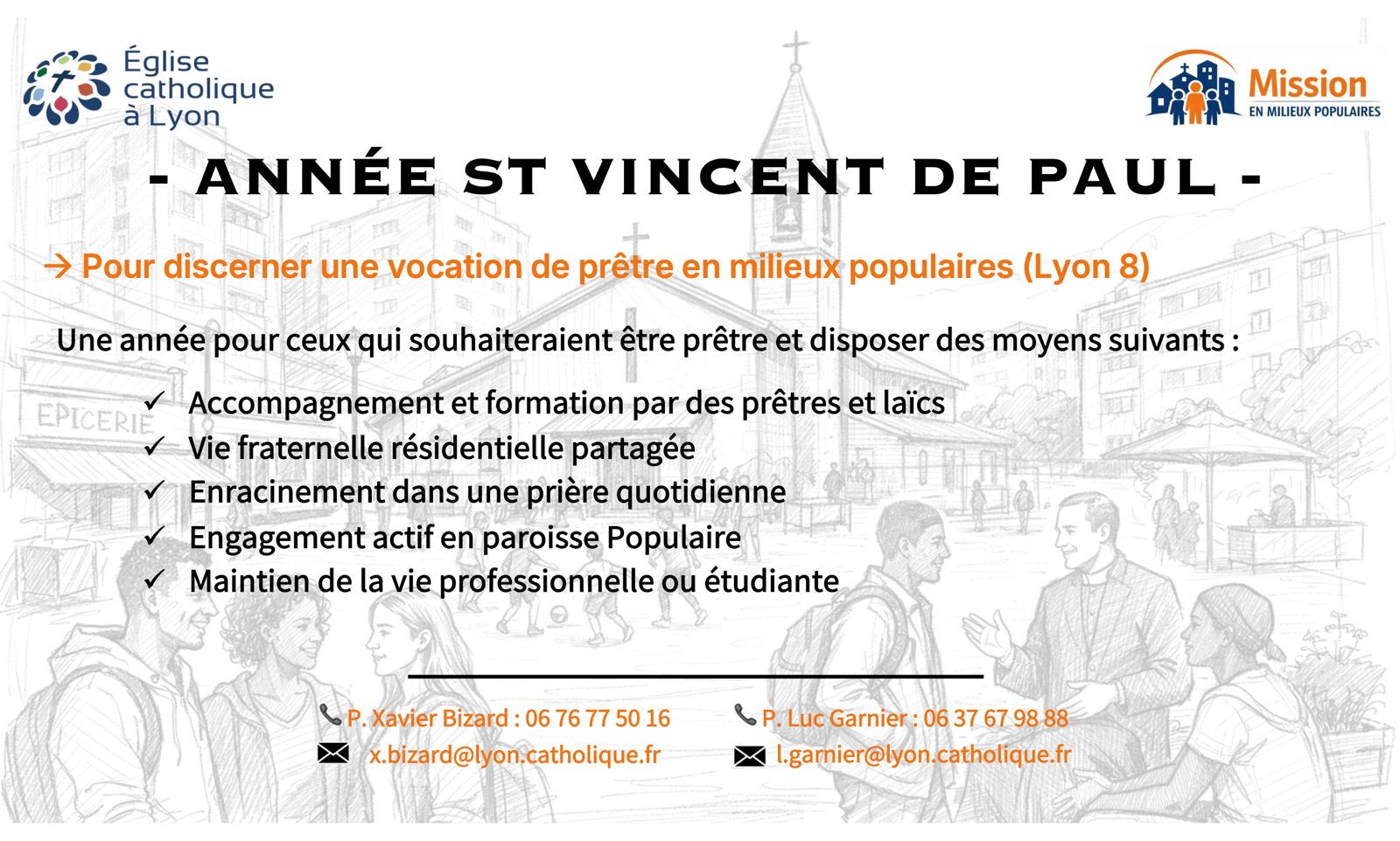 Un lieu de vie résidentiel de 5 à 10 places sera disponible en septembre 2026 à proximité de l’église St Jacques dans le 8ène arrondissement de Lyon. Il s’adresse à des jeunes hommes ayant un emploi ou faisant des études désirant être prêtres diocésains, à l’aise dans les milieux populaires ou de culture populaire, entre 18 et 30 ans, qui seront envoyés en lien avec les services vocations des diocèses de la province. L’objectif de l’année sera le discernement vocationnel engagé dans une vie de paroisse, accompagné par une équipe et au contact d’une fraternité de prêtres.